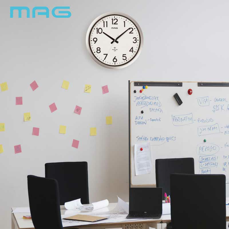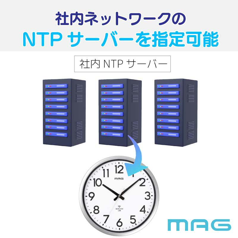 電波時計を購入したのに電波が届かないお部屋におススメ。ネットにつなげて時刻を同期できる掛時計。NTPサーバー接続先を任意選択可能のため、企業様の設備品としても利用できます。しっかり時を刻むステップ秒針(指定時間秒針停止機能付)。軽くて割れにくいアクリル樹脂製の前面カバーで安全面に配慮。