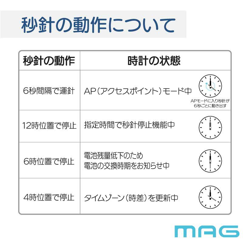機能 無線LAN時計、ステップ秒針、タイムゾーン設定(UTC地域名選択)、秒針停止機能(時間指定可)、電池交換お知らせ機能